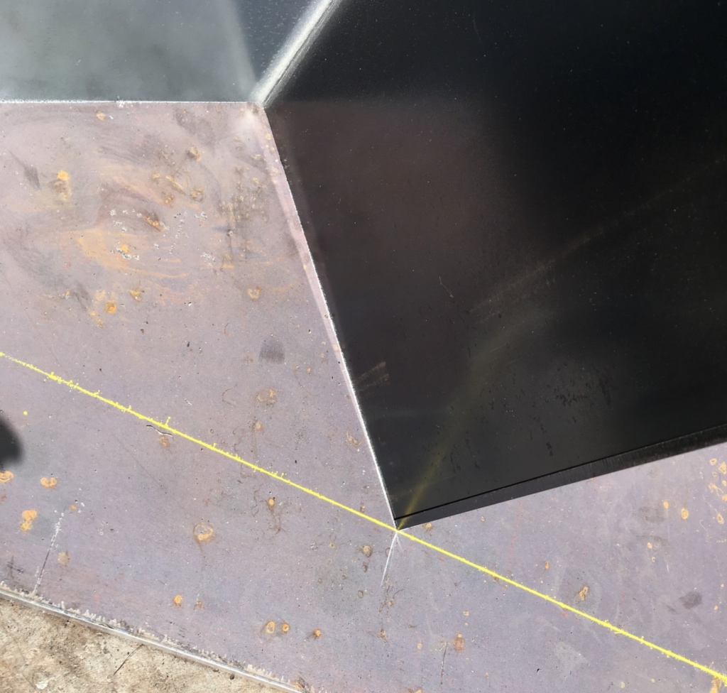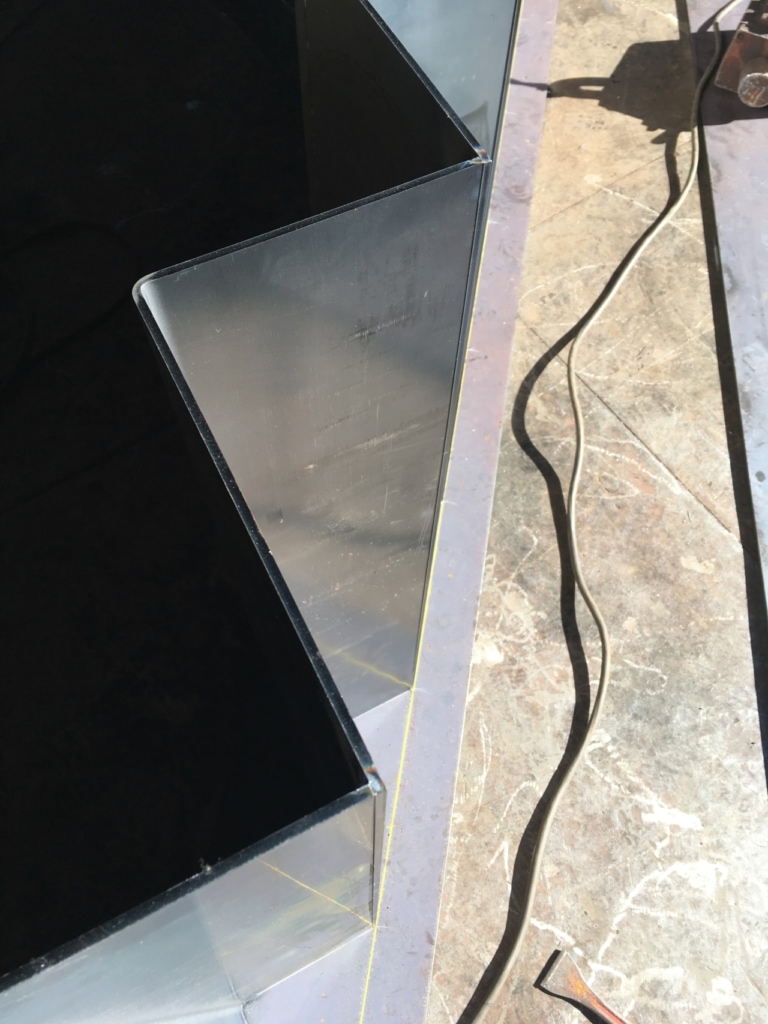 裏側を軽く仮止めです。本当は角を溶接したいところですが、もし間違いがあった時に外しやすくする為に、サンダーが入りそうなギリギリを狙うのがコツです。