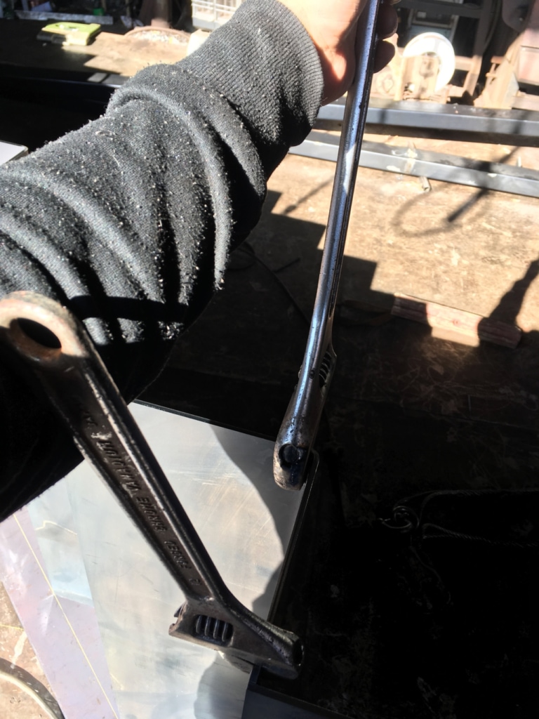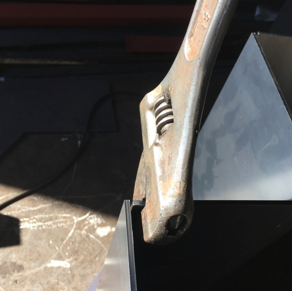 このように、レンチや膝や手を使って調整しながら仮止めをしていきます。片腕は溶接に使うので、どちらかの手や足で操りながら仮止めします。上記の場合は左手でレンチを操って膝で下の板を押せば、ピッタリ溶接できる間合いです。