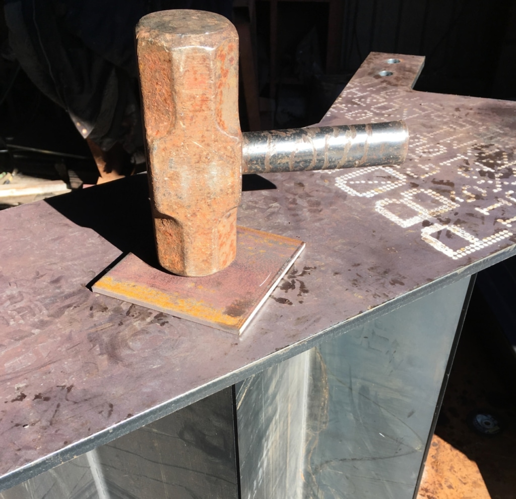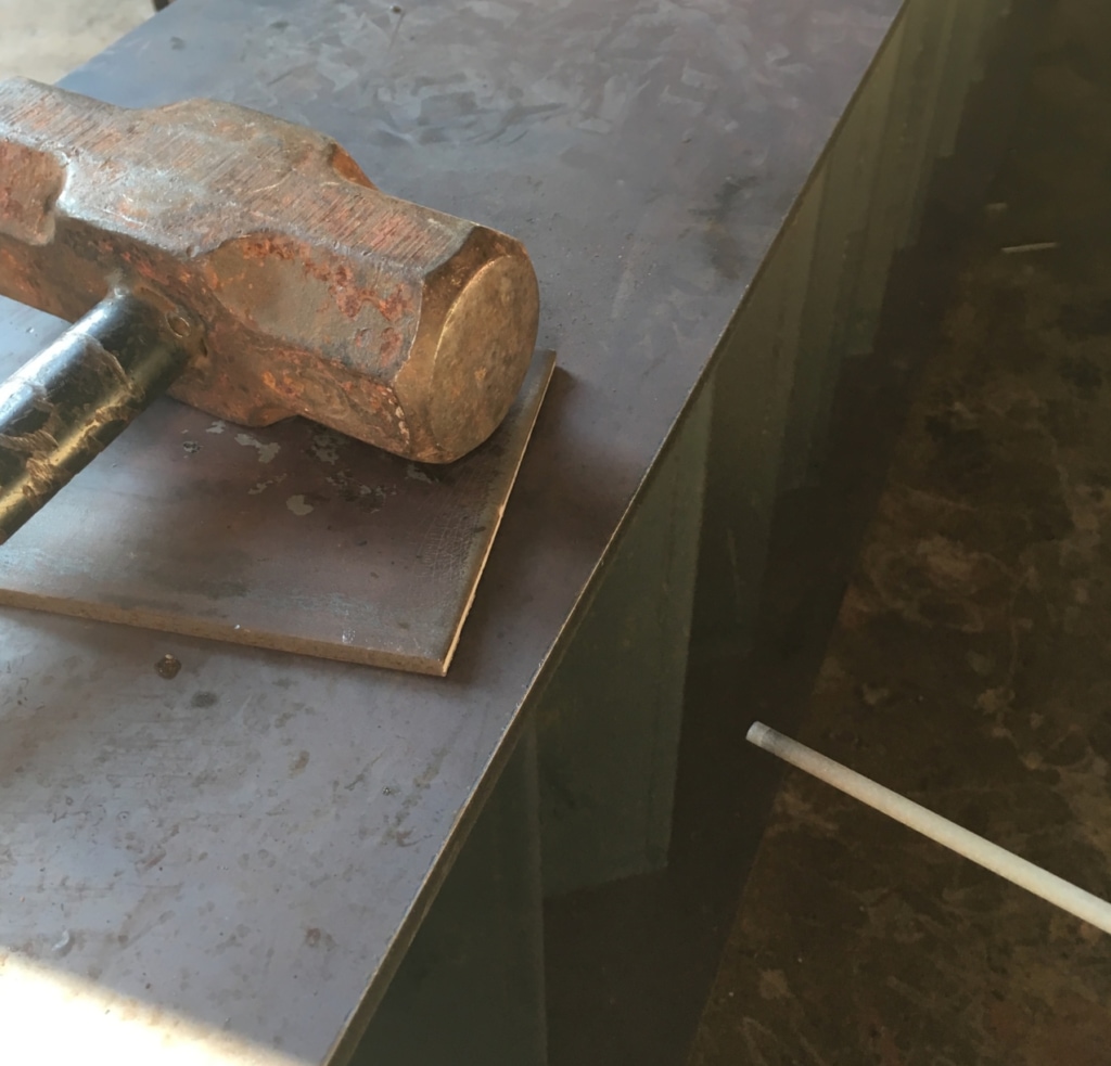 仮止めした瞬間に、上から思いっきりひっぱたくのです。理由は隙間を埋める為です。溶接が固まる前の一瞬を狙うので、すぐに叩けるように用意しておくのがコツです。
