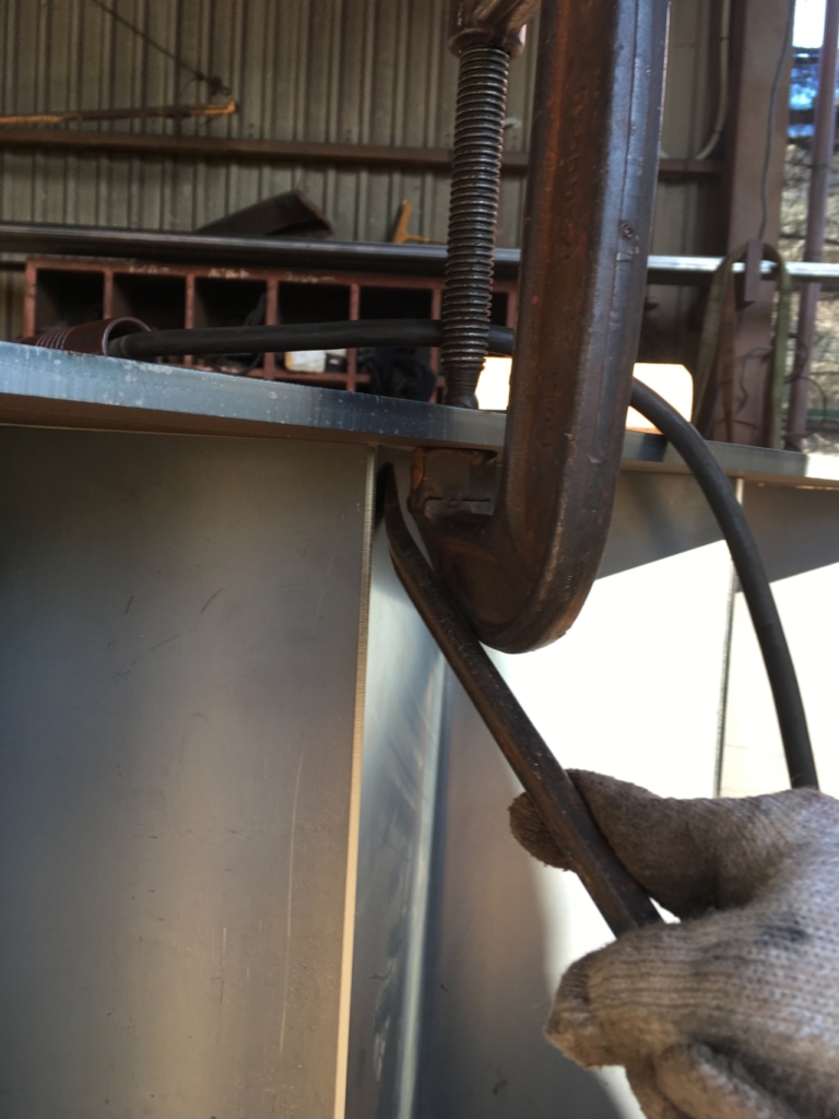 同じ要領で下もつけたら、今度はアングルで上下のプレートがまっすぐになるよう、固定しておきます。後で本溶接をする時に、熱で寄ってしまわないようにする為です。