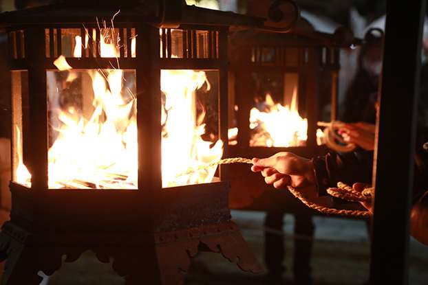 切り出された火は、大きな三つの灯籠に移され、その際、出雲国(現在の島根県)で採れた白朮が加えられる。