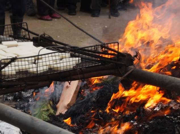 画像:左義長の炎で焼かれる餅(撮影:高野晃彰)
