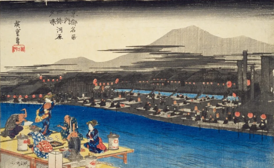 江戸時代の年中行事を伝える『日次紀事(ひなみきじ)』には、「四条河原の水陸、寸地を漏らさず床を並べ、席を設く」とあり、さらに「東西茶店提灯を張り、行灯を掲げて、あたかも白昼の如し。これ河原の涼みという」と、その賑わいが記されている。