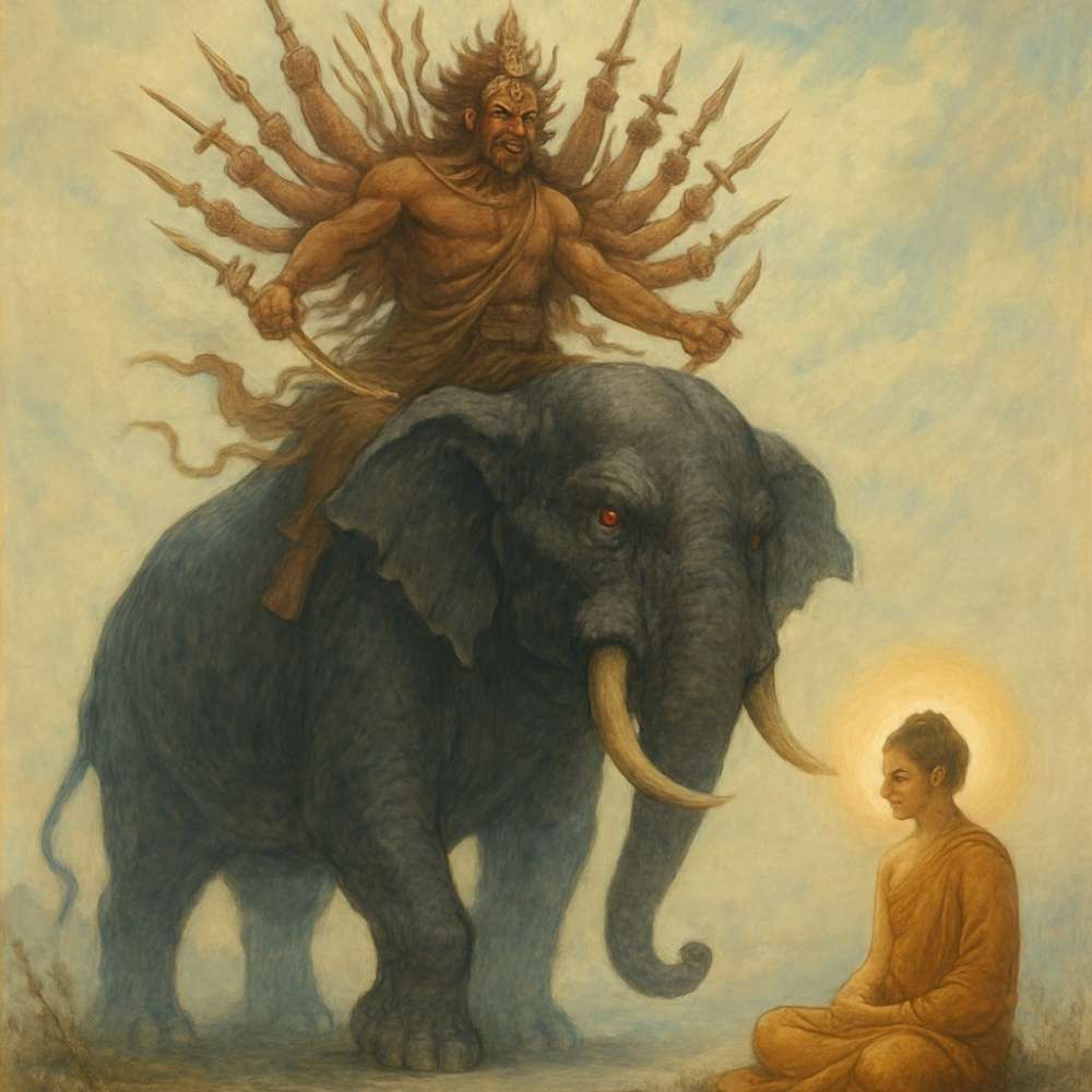画像 : ブッダに襲い掛かるマーラ&ギリメカラ 草の実堂作成(AI)