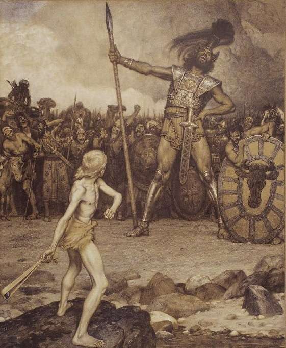 ダビデはゴリアテの話を聞くと、「では私が、かの巨人を退治してご覧入れましょう」などと言い出した。