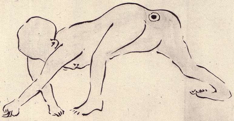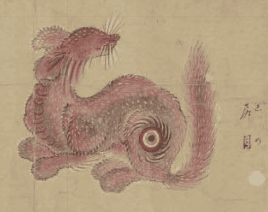 江戸時代の浮世絵師・宮川春水(生没年不詳)の絵巻物『怪物図巻』には、尻目(しりめ)なる動物の妖怪が描かれている。