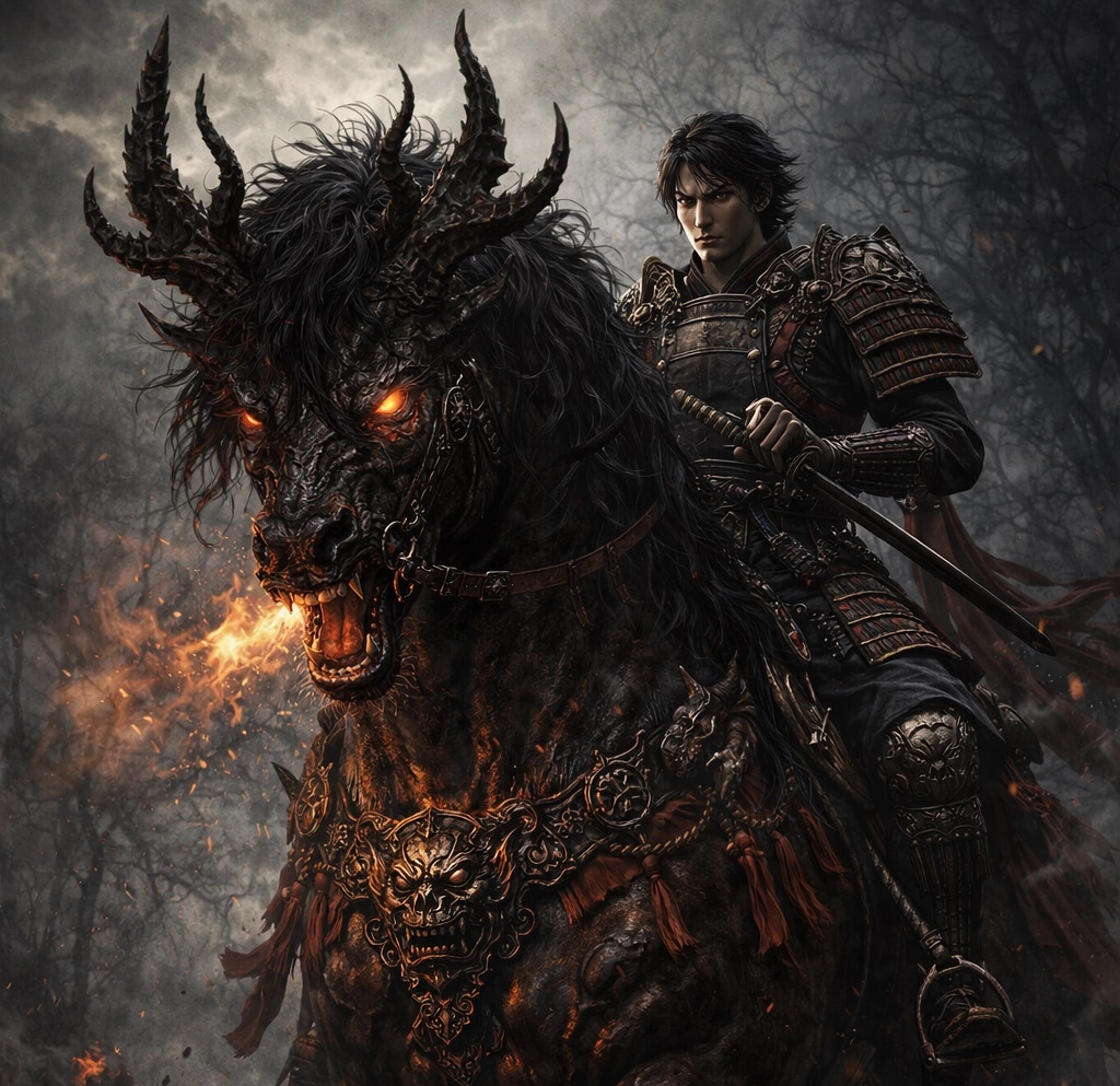 画像 : 小栗判官と鬼鹿毛 草の実堂作成(AI)