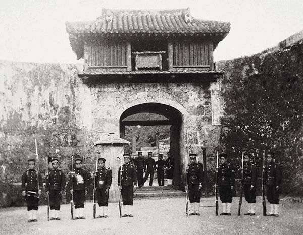 画像:琉球処分のとき、首里城門に前に立つ日本政府軍 public domain