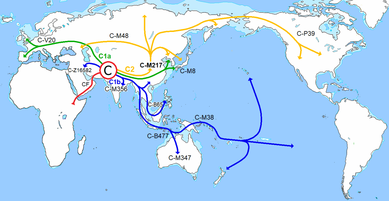 画像 : Y染色体ハプログループCの分布図。C-M217がチンギス・ハンの男系子孫に由来すると推測された。Eupedia CC BY-SA 4.0