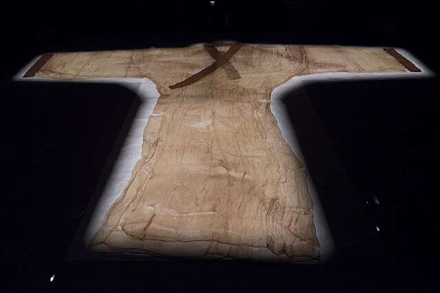 画像 : 直裾素紗襌衣(ちょくきょ そさぜんい)。馬王堆一号墓から出土した極薄の絹衣で、重さはわずか49グラム。透けるほど軽く、当時の最高水準の織技を示す Public Domain