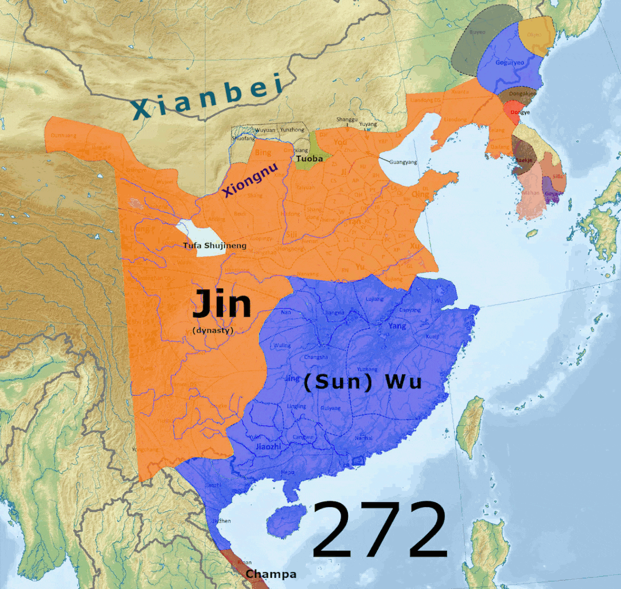 画像 : 三国時代終盤(272年頃)の勢力図「橙が晋、青が呉」 Qiushufang CC BY-SA 4.0