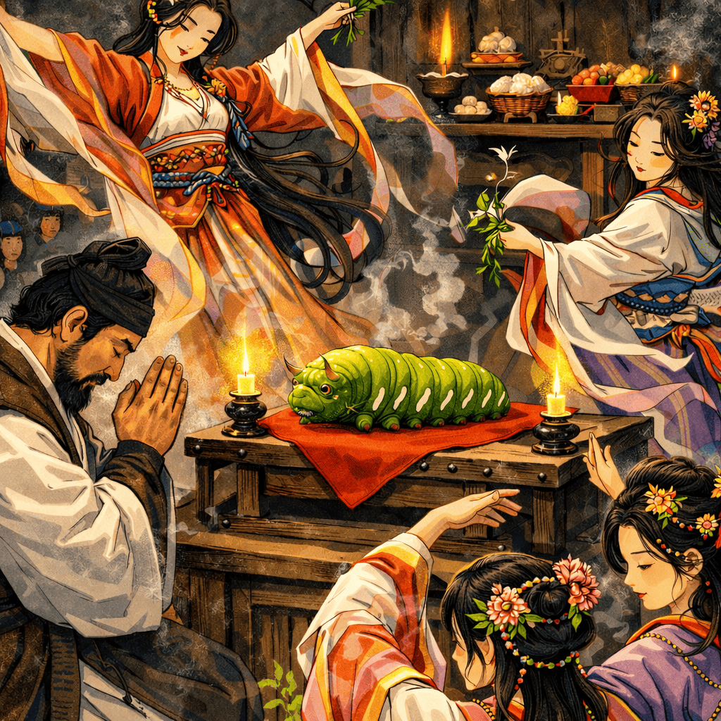 画像 : 常世神(イモムシ)を祀る儀礼の想像図(※イモムシは誇張表現) 草の実堂作成(AI)