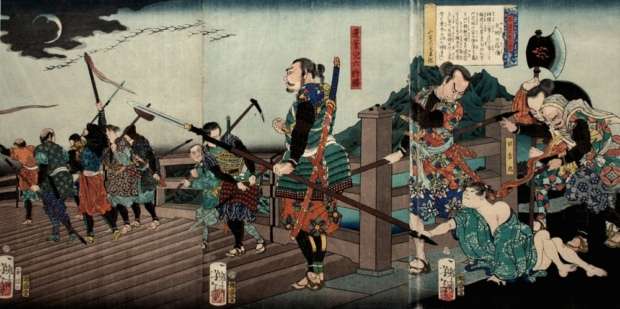 画像:月岡芳年 『美談武者八景、矢矧の落雁』。矢矧橋における蓮葉兒六将勝(蜂須賀小六正勝)