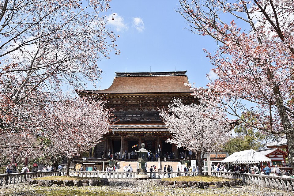画像:桜開花時期の金峯山寺。 wiki cc Draupnir3