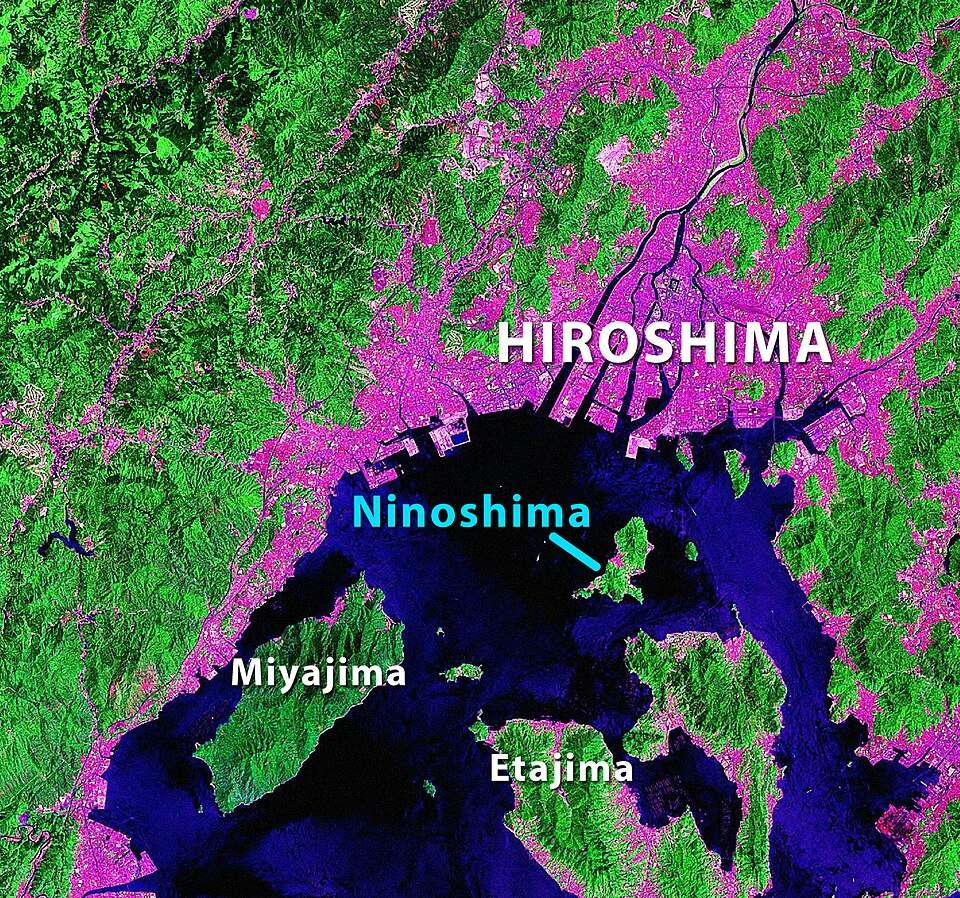画像 : ランドサット衛星写真より作成。水色文字位置が似島(にのしま)検疫所。検疫所は海に面した島の東半分の敷地に置かれた。Aude CC BY-SA 3.0