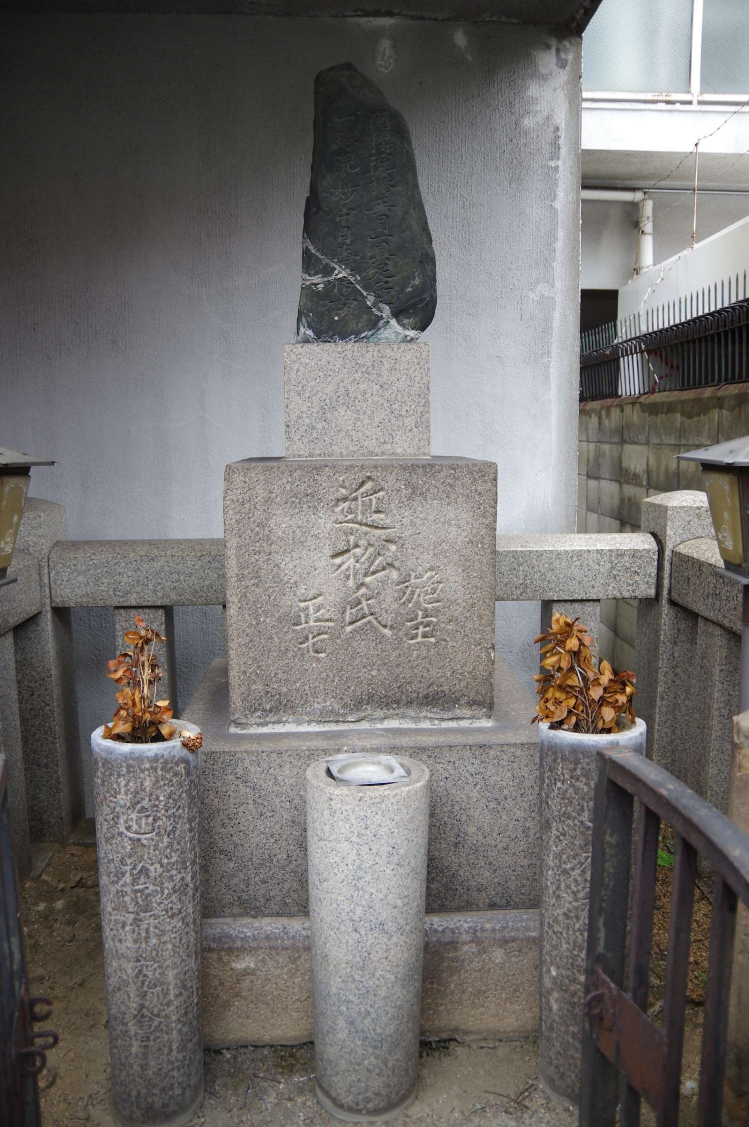 近松門左衛門の墓所は、現在ではマンションに挟まれた細い路地の奥にひっそりと佇む。