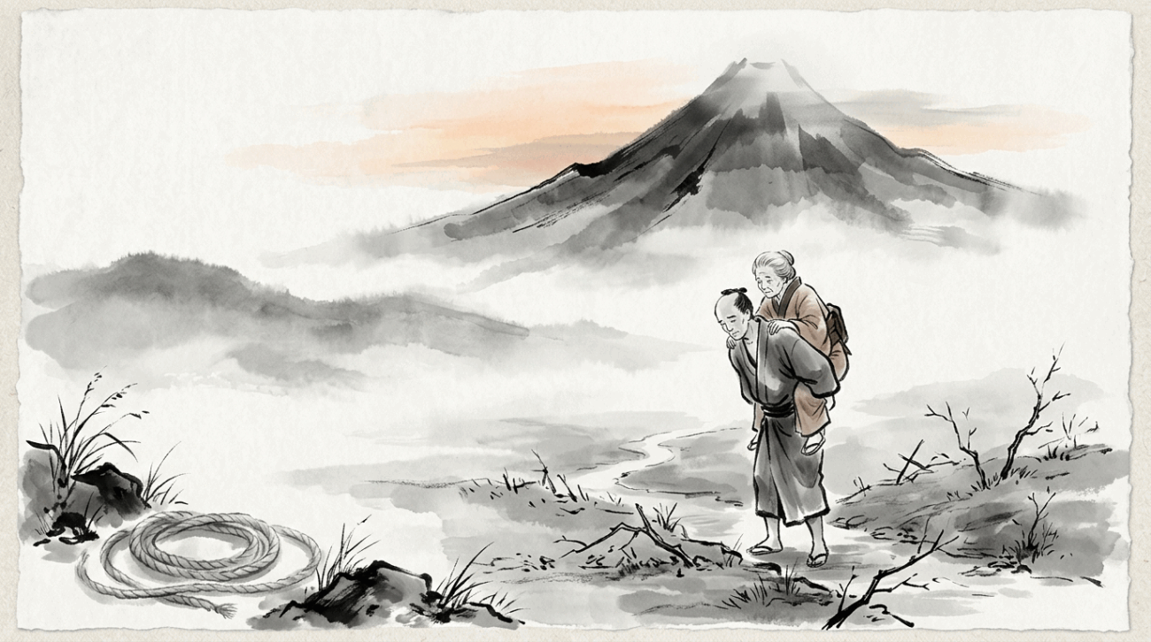 母に促され、男はしぶしぶ母を背負って山へ入りました。