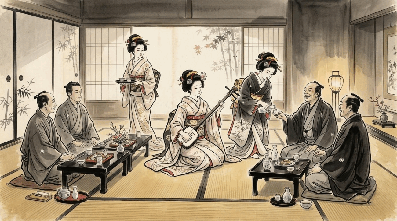 芸者や幇間(太鼓持ち)を呼んで酒を飲み、芸を楽しみながら過ごす「待ちの時間」自体がすでに遊興の一部であり、課金の対象でした。
