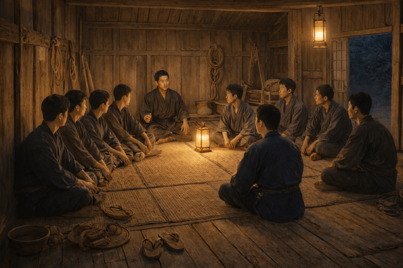画像:若者組(若衆宿)のイメージ。村の性規範は、こうした若者組織を通じて伝えられていた。(イメージ)