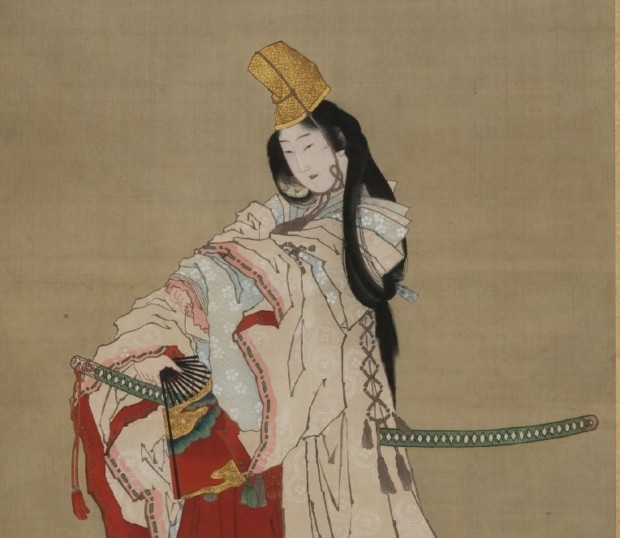 画像:肉筆画で描写された白拍子姿の静御前(葛飾北斎筆)public domain