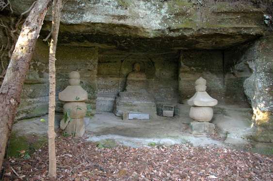 その背後、東の谷の中腹には岩窟が3つ並び、大きな石碑と玉垣に囲まれた墓域となっている。