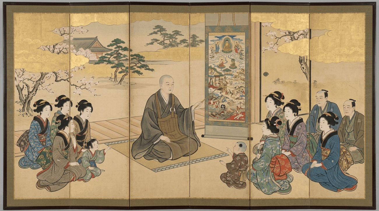 画像:曼荼羅を広げて絵解きをする熊野比丘尼。主に聴衆は女性と子供だった。※イメージ