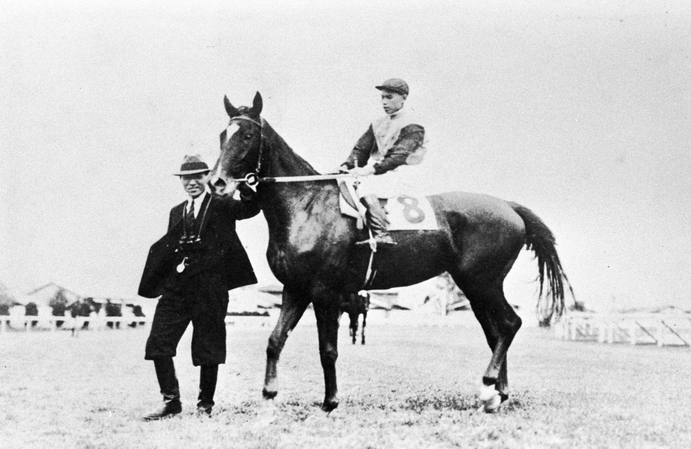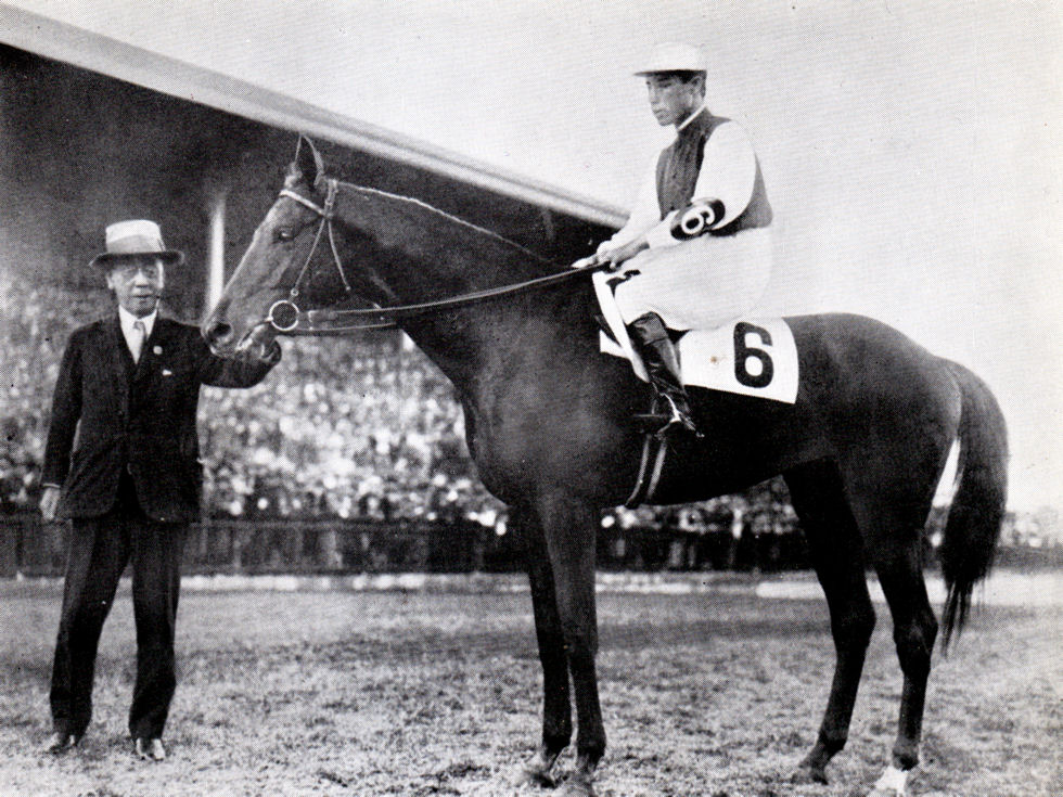 画像:騎手時代の尾形藤吉と、後に金メダリスト西竹一とともにベルリン五輪にも出場した名馬アスコット public domain