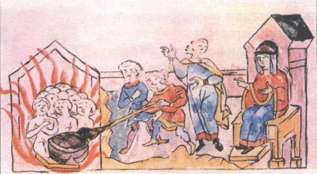 画像:オリガの復讐(イスコルステニを焼き討ちし住民を討つ場面)15世紀ラジヴィウ年代記 Public Domain
