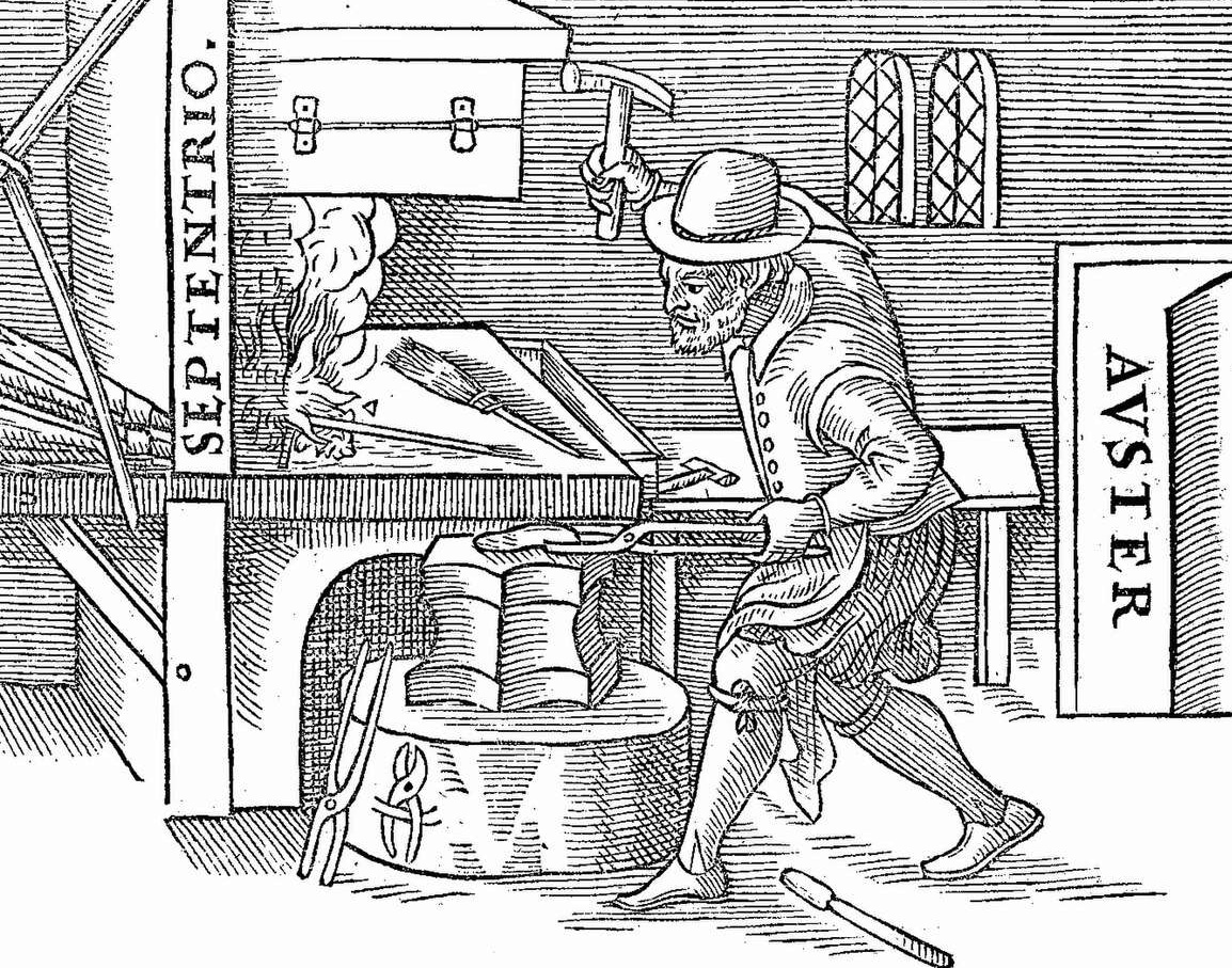 画像 : 鉄を赤熱し、南北方向に保持して鍛打することで地磁気により磁化される過程を示した図(ウィリアム・ギルバート『De Magnete』1600年) CC BY 4.0