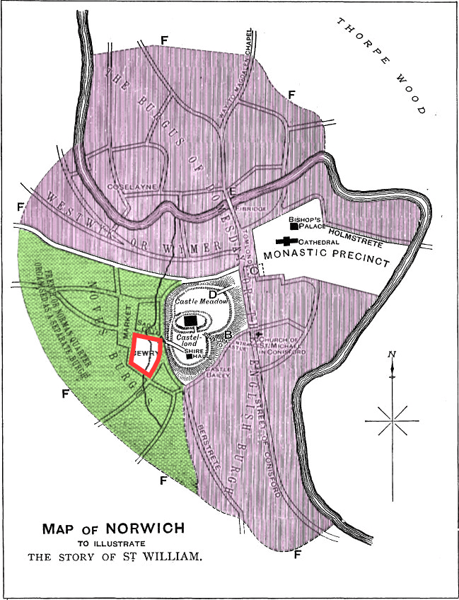 画像:中世ノーウィッチの地図。赤で示されているのがユダヤ人居住地であった区域 wiki c Amitchell125