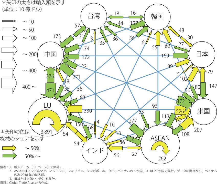 画像 : アジアを中心とした貿易フロー(2019年) サプライチェーンの全体像 出典: 経済産業省HP PDL1.0