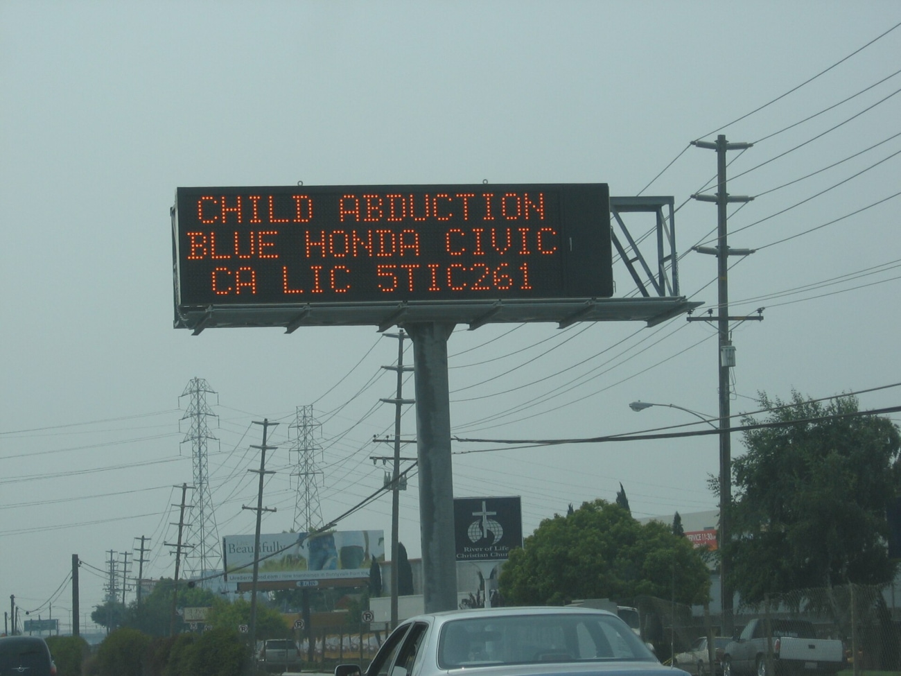 画像 : カリフォルニア州の高速道路の電光掲示板に表示されたアンバーアラート。「児童誘拐。青いホンダ・シビック。カリフォルニアのナンバー5TIC261」と表示されている。Bob Bobster CC BY 2.0