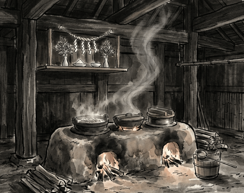 画像:日本の民家に据えられた竈(かまど)。調理設備だけではなく、荒神や竈神が宿る神聖な場として扱われた。※イメージ