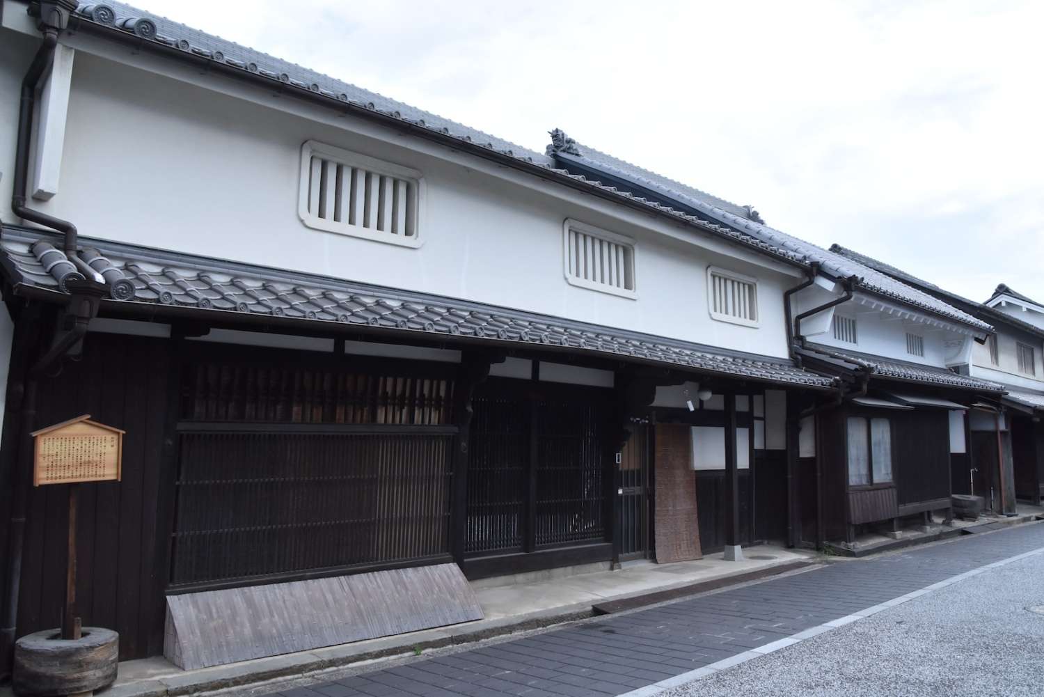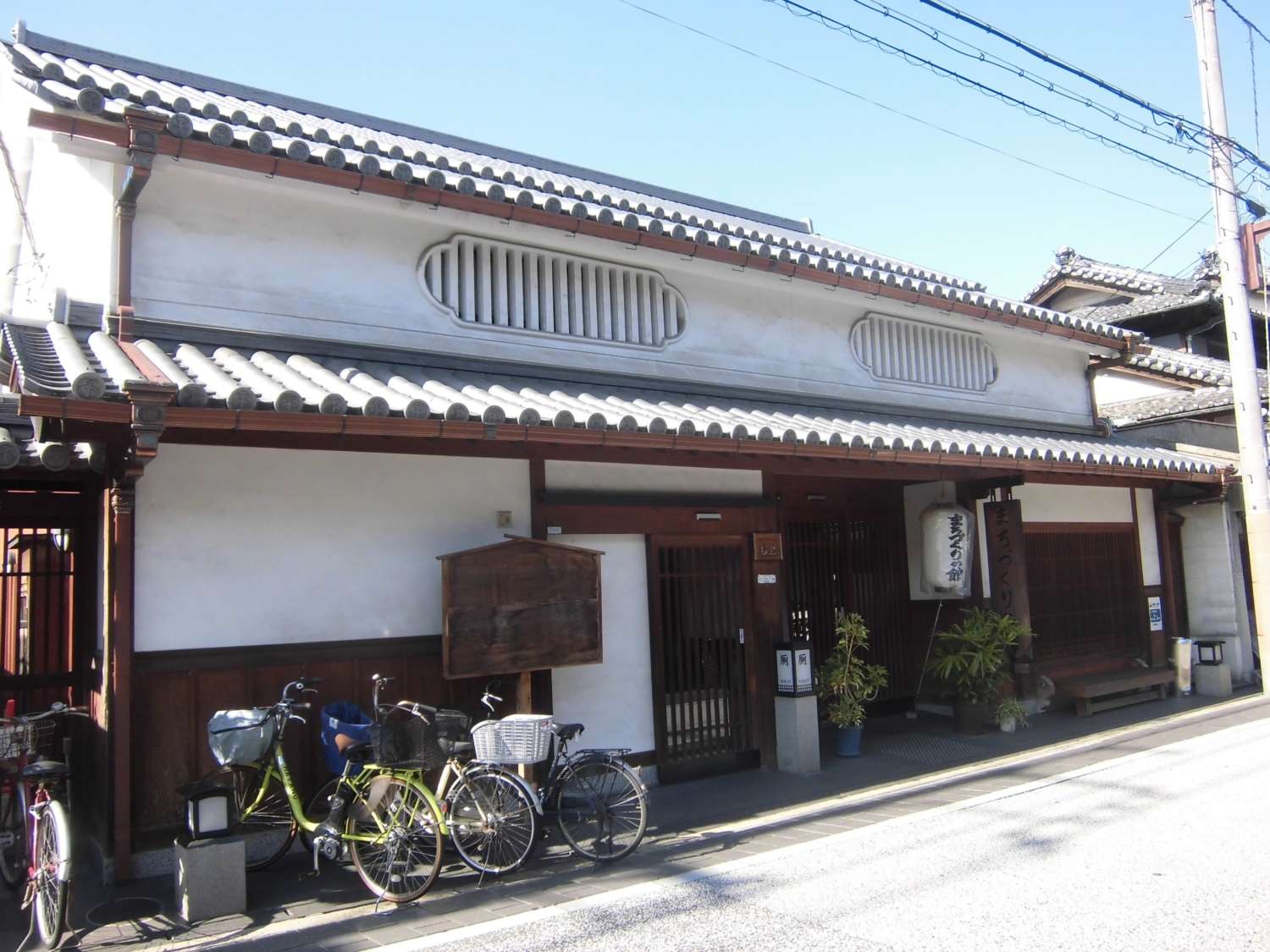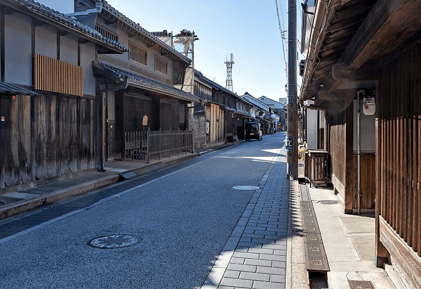 岸和田城のすぐ西側を走る街道沿いには、城下町時代を支えた商家群が見られる本町エリアがあり、本瓦の屋根や虫籠窓のある中二階・出格子など、当時の風情を残す町家建築を見ることができる。