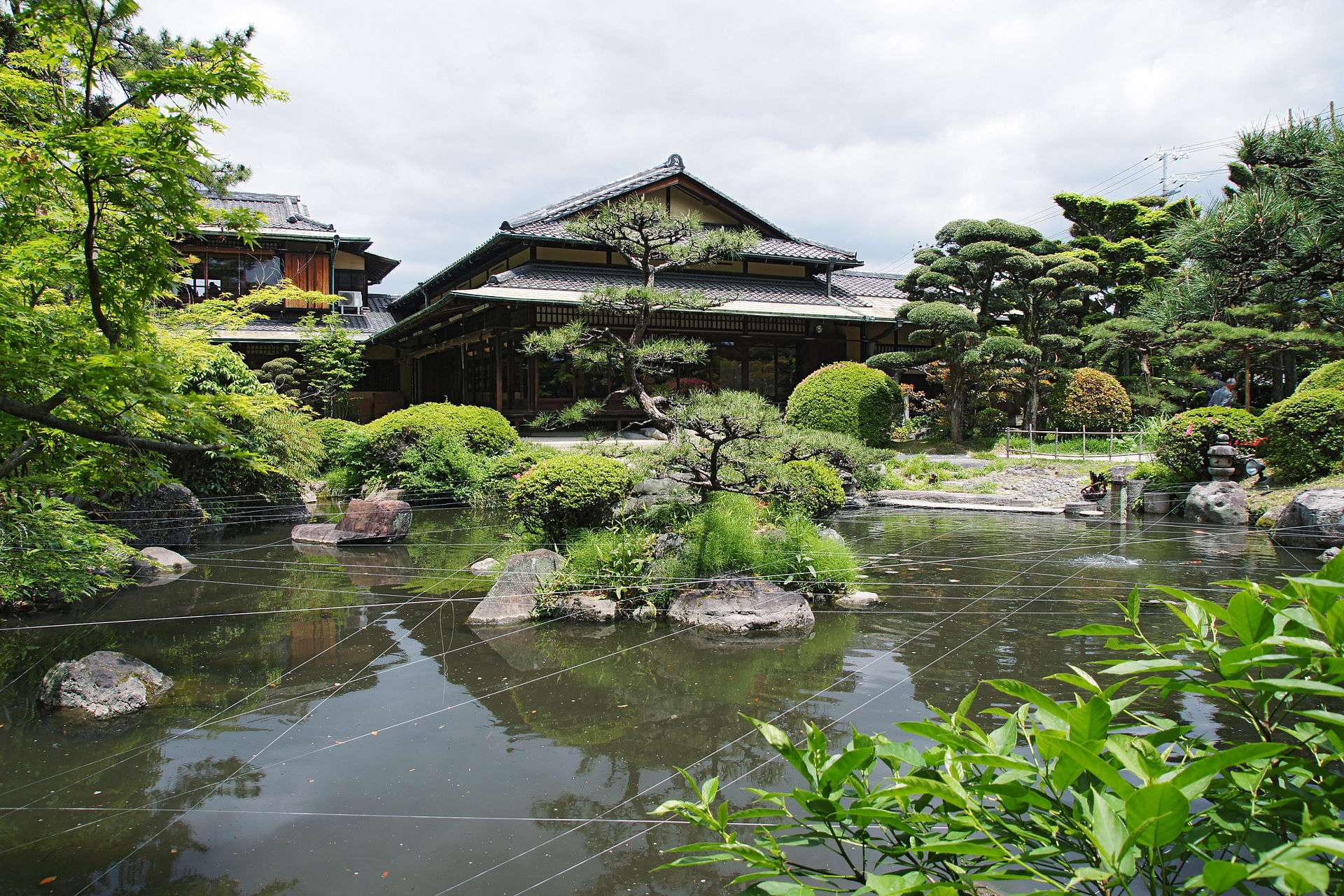 母屋の他、日本建築の数奇を凝らした3つの茶室があり、正門は奈良東大寺塔頭・中性院表門を移築した。