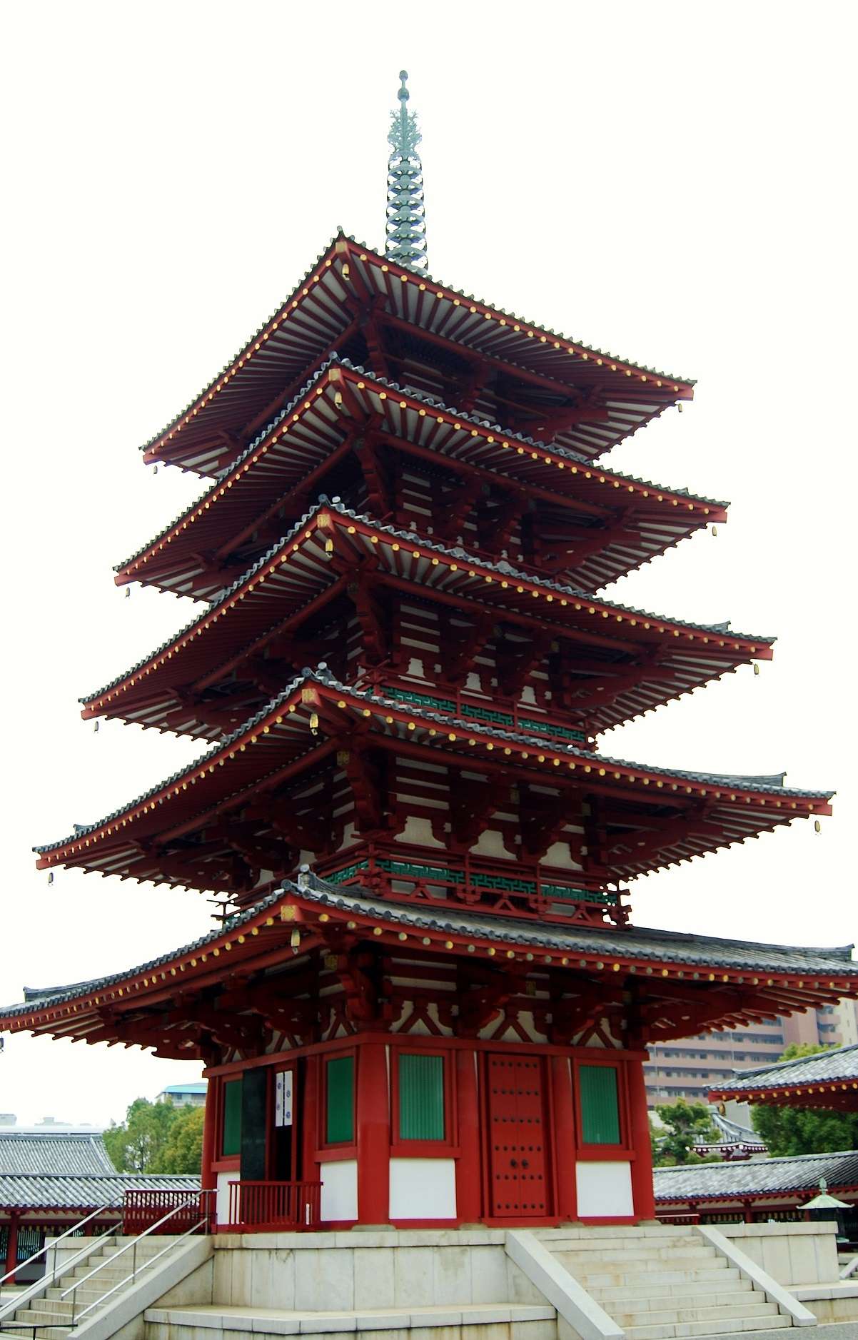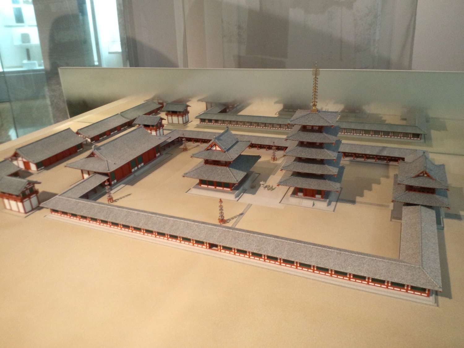 画像 : 創建時の四天王寺伽藍模型南(この画像では右から左へ)中門、五重塔、金堂、講堂を一直線に配置するのが特色。Yanajin33 CC BY-SA 3.0