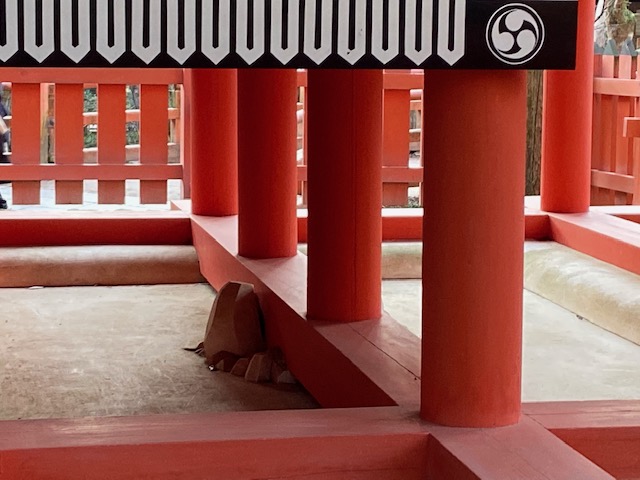 一方の陽石は、社殿の土台基礎部分、井桁に組まれた土台の中央に、朱塗りの木材に押し込まれるような形で存在しています。