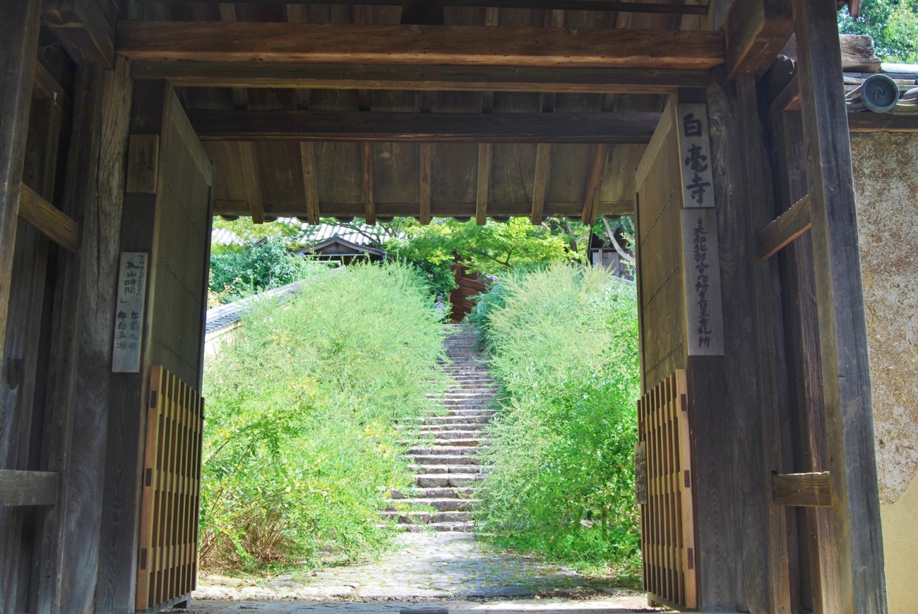 町並みを抜けると、白毫寺の山門へと続く石段が現れます。