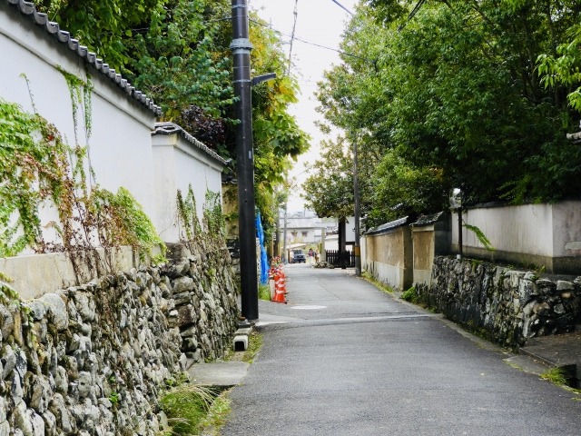 町家が建ち並ぶ、いわゆる「ならまち」とは雰囲気が変わり、この辺りには広い庭を持つ屋敷風の住宅が多く、観光客も比較的少ないため、静かな散策が楽しめる落ち着いた街並みが広がっています。