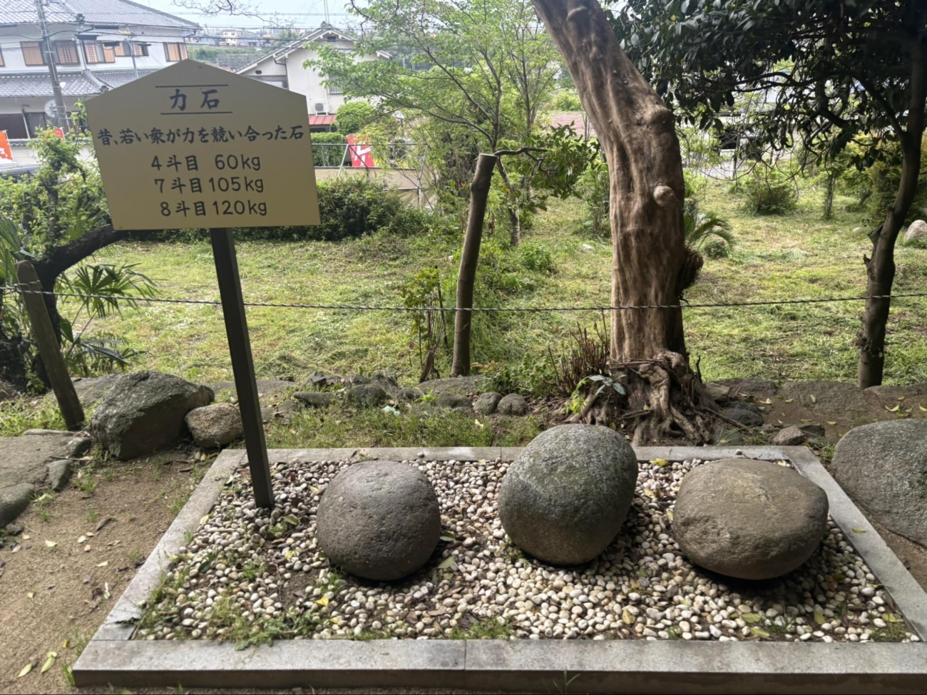 そんな腰神神社は石とのゆかりがあることから境内に力石が置いてあり、今も60kg~120kgの重さの石が置いてあります。昔の若者がこの石を持ち上げて力を競い合ったそうです。