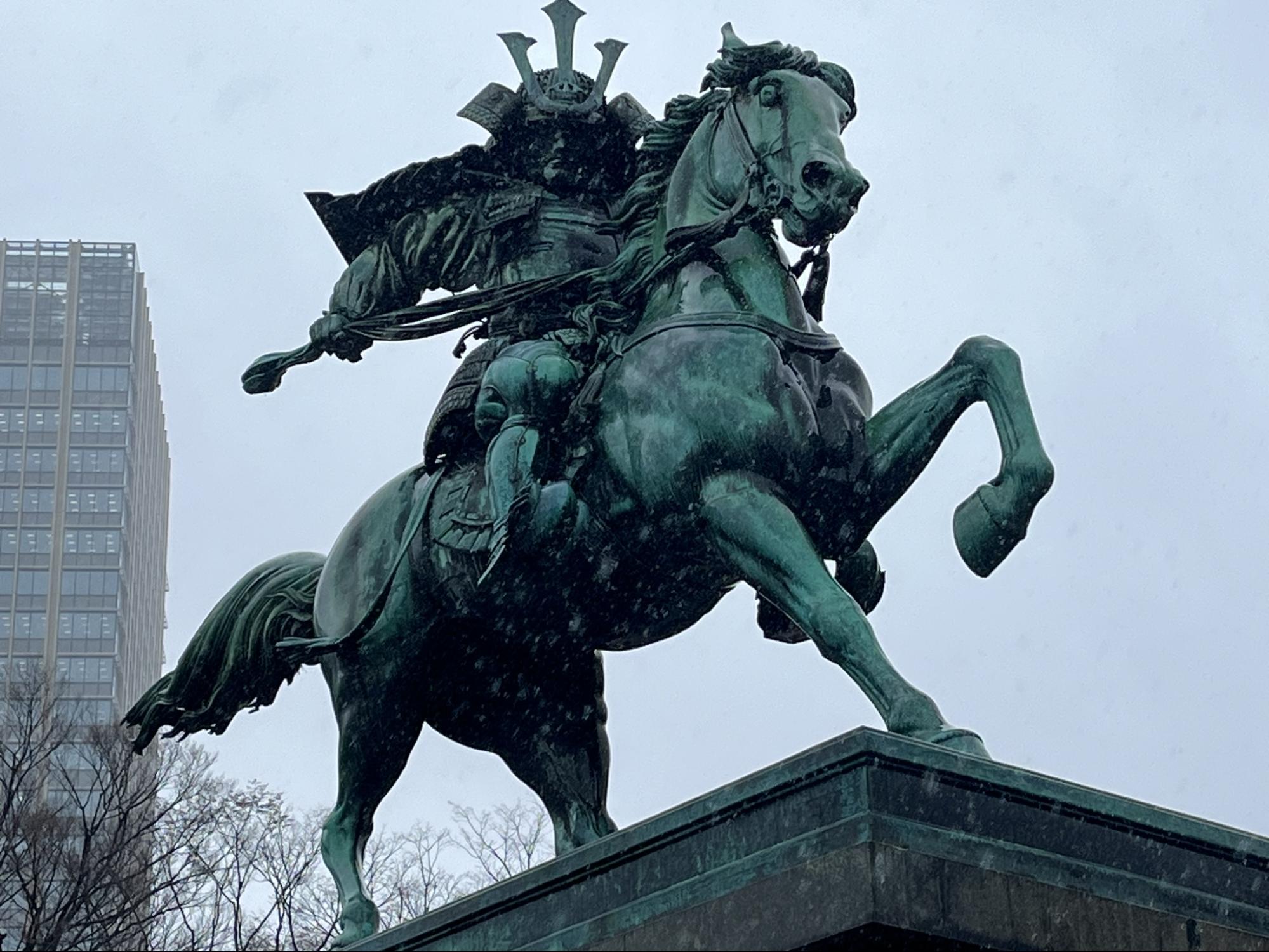 (皇居外苑にある楠木正成像。またがっている馬が千早丸)