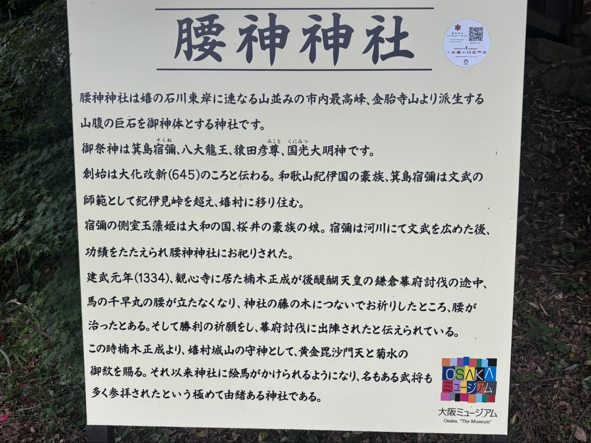 腰神神社境内の説明板では、中世の楠木正成の時代よりもはるか昔の創建伝承があり、それによれば大化の改新の頃にまで遡ります。